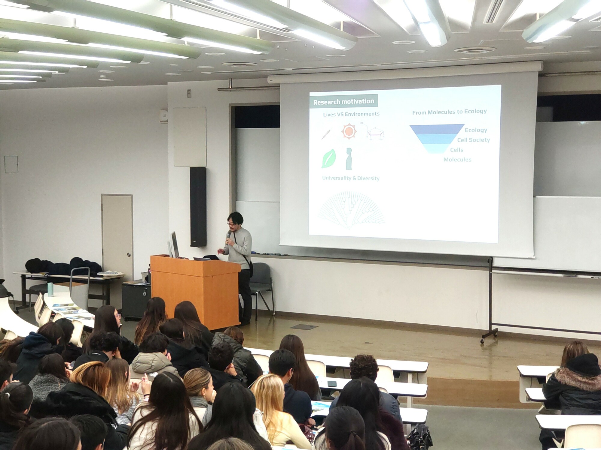 去る1月14日(水)、メキシコから120名超の高校生が本学を訪問しました。高大連携室の浅利みなと先生による本学紹介の後、理学部生命科学科の成川礼准教授による模擬講義、その後、本学在学中のメキシコ人大学院生との交流、と短い時間ではありましたが内容の濃い訪問となりました。成川先生の講義後は数人の学生が演台まで質問に訪れるなどとても積極的な高校生達でした。以下、成川先生より講義の内容と感想をいただきましたので掲載します。