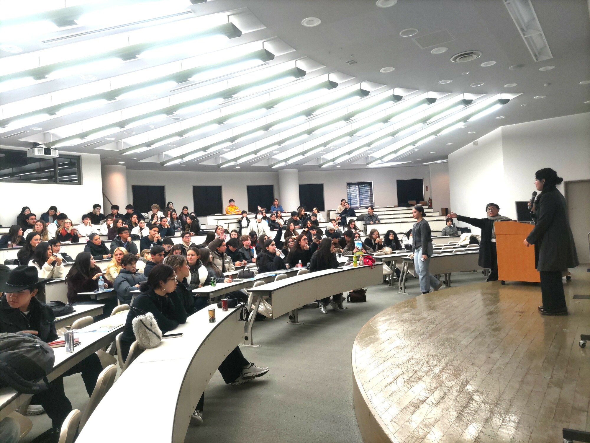 「2026年1月14日(水)、イギリスの教育団体の企画により、メキシコから120名弱の高校生が東京都立大学に来訪しました。理学部生命科学科に所属している私(成川礼)が、「Cyanobacterial light-sensing strategy and its application to optogenetics and fluorescent imaging(シアノバクテリアの光応答戦略と、オプトジェネティクスおよび蛍光イメージングへの応用)」と題した模擬講義を行いました。